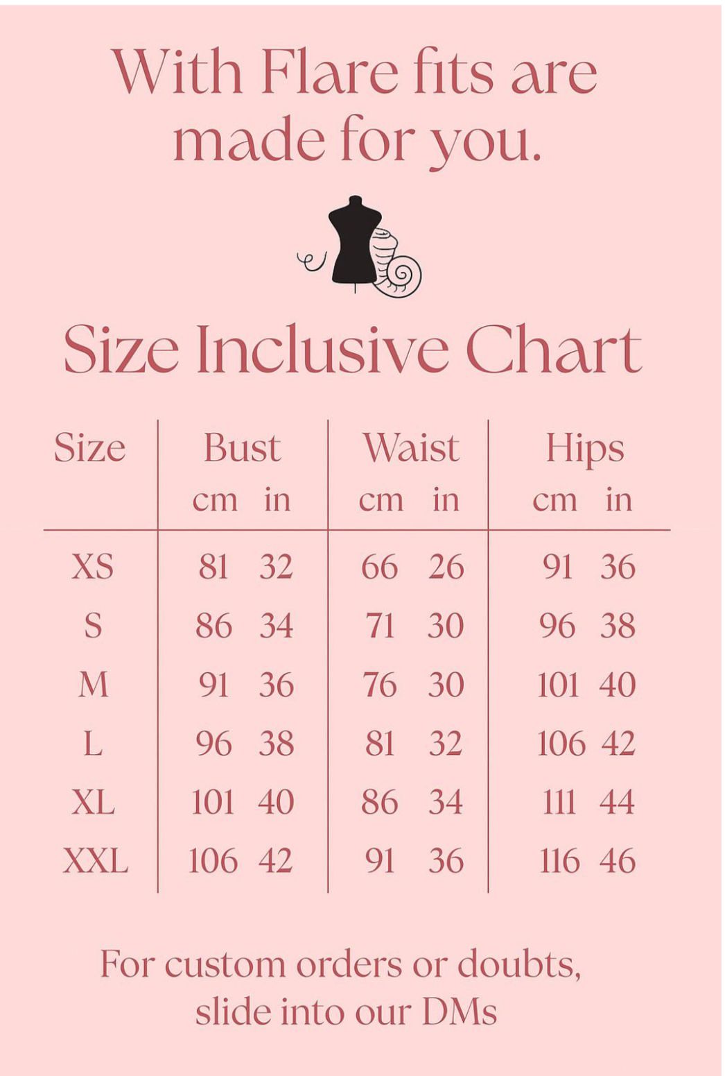 | Size | Bust (cm/in) | Waist (cm/in) | Hips (cm/in) |